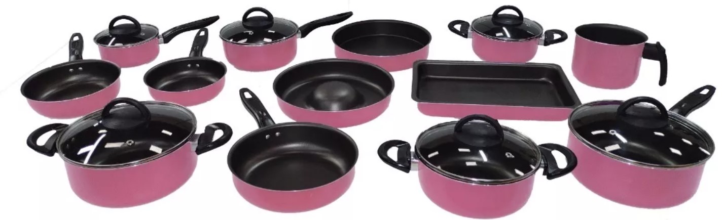 JOGO DE PANELAS TEFLON 13 PC ANTIADERENTE C/ ASSADEIRA - ROSA