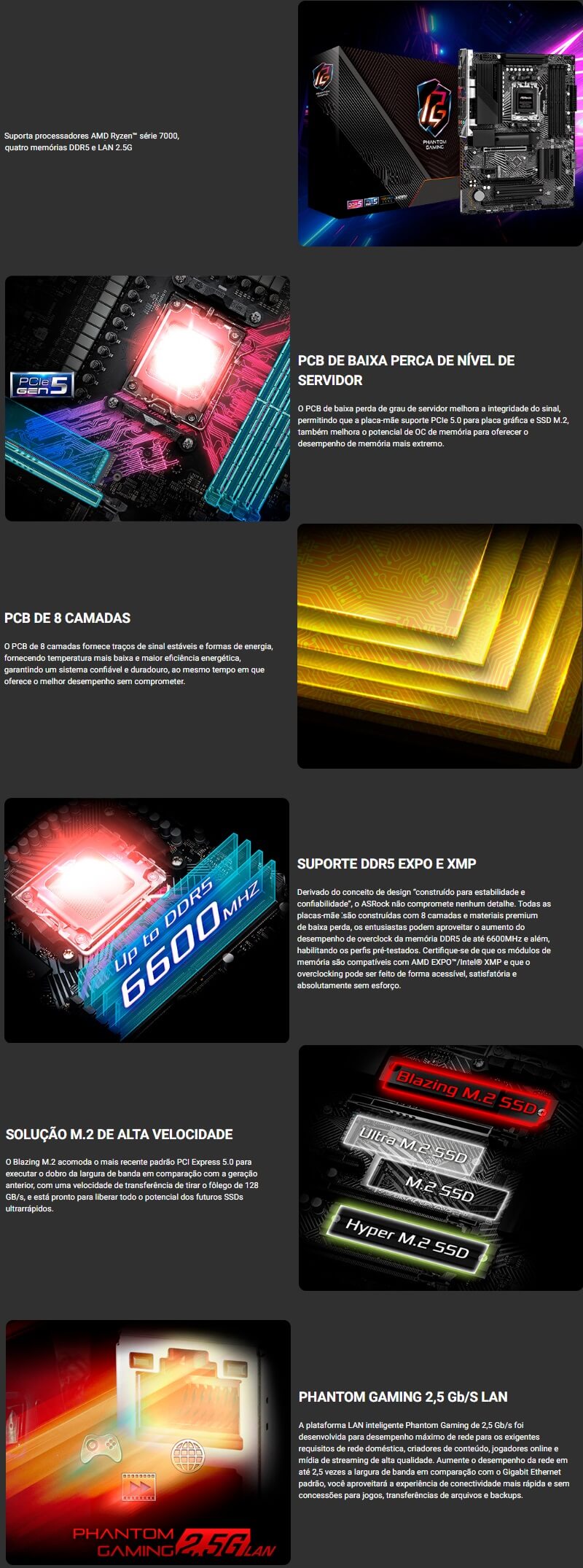 As placas-mãe Asrock também passam por rigorosos testes de resistência para garantir que possam lidar com condições em que outras podem falhar. Esteticamente, este modelo incorpora elementos de design geométrico e off-black robustos para refletir a confiabilidade e estabilidade. Com fornecimento de energia atualizado e opções abrangentes de refrigeração para alimentar as CPUs mais recentes da AMD, além de suporte para memória e armazenamento mais rápidos, é a base perfeita para o seu próximo equipamento de batalha de alta contagem de núcleos.