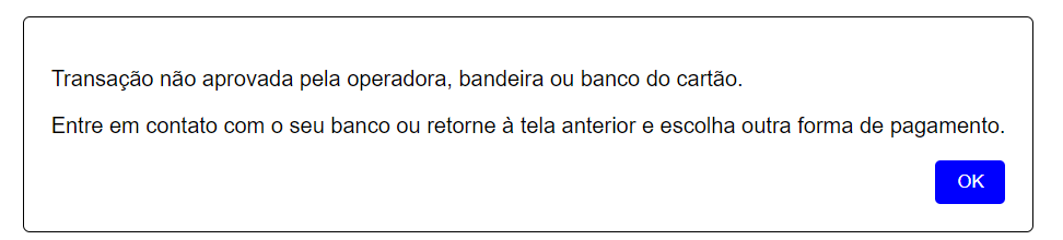 Motivo: Cartão de crédito e/ou débito não aprovado pelo banco e/ou operadora e/ou barrado pelo sistema anti-fraude.