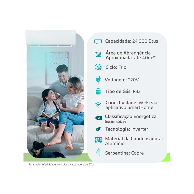 O Ar-Condicionado Split Inverter Springer Midea High Wall, um verdadeiro avanço em conforto climático e eficiência energética. Com conectividade Wi-Fi, você terá controle total sobre o ambiente em que vive, diretamente pelo aplicativo SmartHome. Monitore o consumo de energia, ajuste o uso de acordo com suas metas de consumo e receba alertas no seu celular. Além disso, a curva de sono pode ser personalizada para a temperatura que mais lhe agrada, e a geolocalização do celular permite que o ar-condicionado se ajuste automaticamente quando você está chegando em casa. E se preferir, controle tudo com comandos de voz via Google Assistant ou Alexa, tornando sua experiência ainda mais inteligente. A tecnologia não para por aí. Com o modo Turbo, esse aparelho alcança a temperatura desejada em apenas 6 segundos, proporcionando conforto imediato. A placa Inverter possui cobertura em acrílico para proteção contra umidade e condições adversas, ideal para regiões costeiras. A tecnologia Gold Fin na condensadora oferece proteção extra contra oxidação e corrosão, garantindo maior durabilidade e vida útil. A função Eco Noite economiza até 70% de energia quando ativada, enquanto o sistema AIR MAGIC com tripla filtragem e ionizador elimina até 99,9% dos vírus e bactérias, além de remover pólen e impurezas do ar, garantindo a qualidade do ar que você respira. E tudo isso com o uso do fluido refrigerante ecológico R32, que oferece maior performance e menor impacto ambiental. Além desses recursos, o Ar-Condicionado Springer Midea High Wall apresenta uma série de funções como Siga-me, Dormir, Clean, ECO, Energy, Timer e LED, permitindo um controle preciso e personalizado da sua experiência climática. O controle remoto, com backlight para operação em ambientes escuros e indicador de carga fraca da bateria, oferece ainda mais comodidade. Você também pode bloquear teclas específicas, como TURBO e CLEAN, quando necessário. As aletas horizontais oscilantes e ajustáveis permitem um direcionamento do ar mais eficiente, enquanto os 4 modos de operação e 5 velocidades de ventilação garantem versatilidade para todas as estações. Não perca a chance de transformar seu espaço em um ambiente mais agradável e eficiente com o Ar-Condicionado Springer Midea High Wall.
