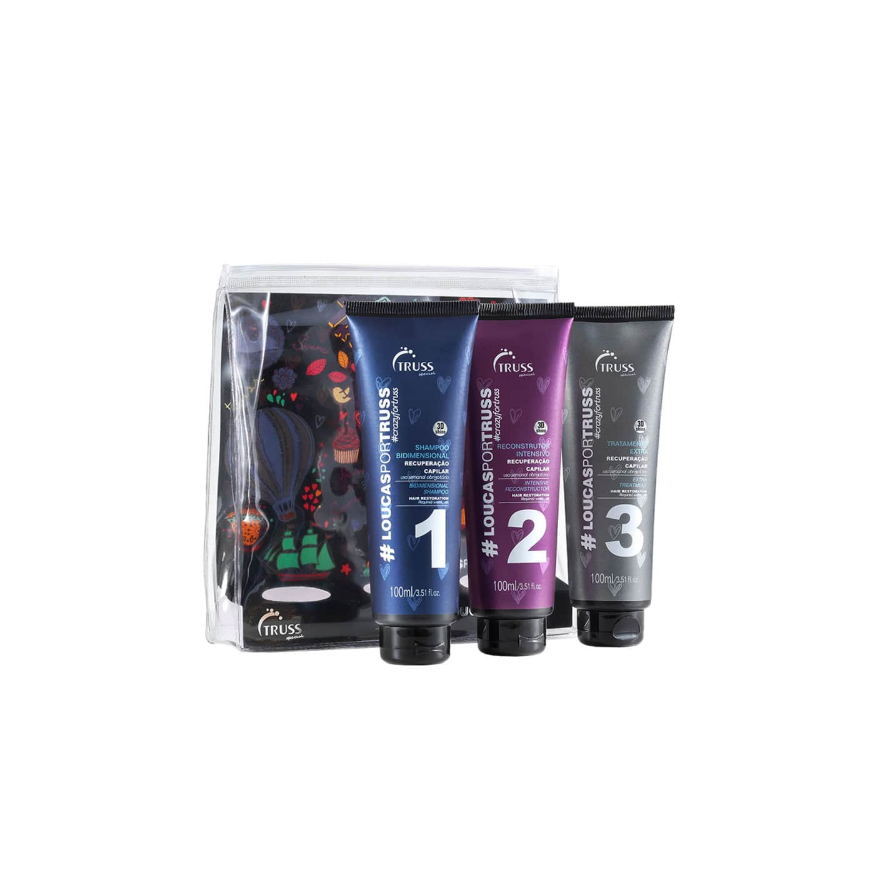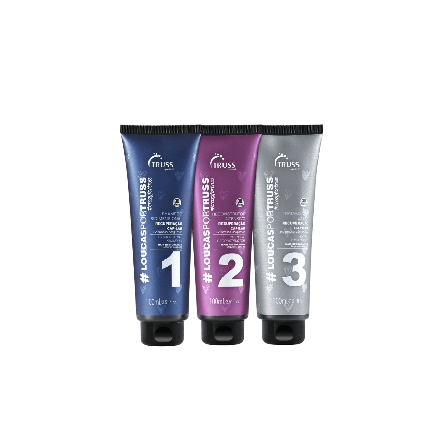 Kit de tratamento completo para cabelos quimicamente tratados. Kit porTruss reconstrói, nutre os fios e protege das agressões externas enquanto aumenta a durabilidade dos processos químicos feitos no salão. Kit hashtagLoucasPorTruss realiza uma recuperação rápida no cabelo sensibilizado para devolver a vitalidade perdida durante a coloração, descoloração, relaxamento ou alisamento. E mais: ele dá densidade e recupera todos os danos causados das fibras capilares. Em apenas 7 minutos durante o banho, seu cabelo é limpo, hidratado e nutrido, ganhando corpo, luminosidade e movimento natural.