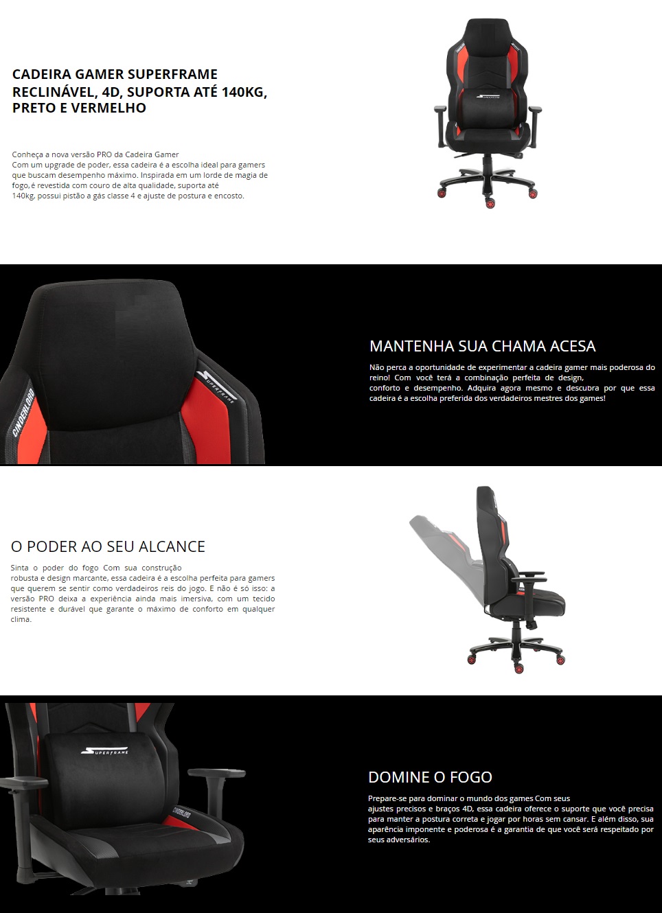 Conheça a nova versão PRO da Cadeira Gamer SuperFrame. Com um upgrade de poder, essa cadeira é a escolha ideal para gamers que buscam desempenho máximo. Inspirada em um lorde de magia de fogo, a cadeira é revestida com couro de alta qualidade, suporta até 140kg, possui pistão a gás classe 4 e ajuste de postura e encosto.