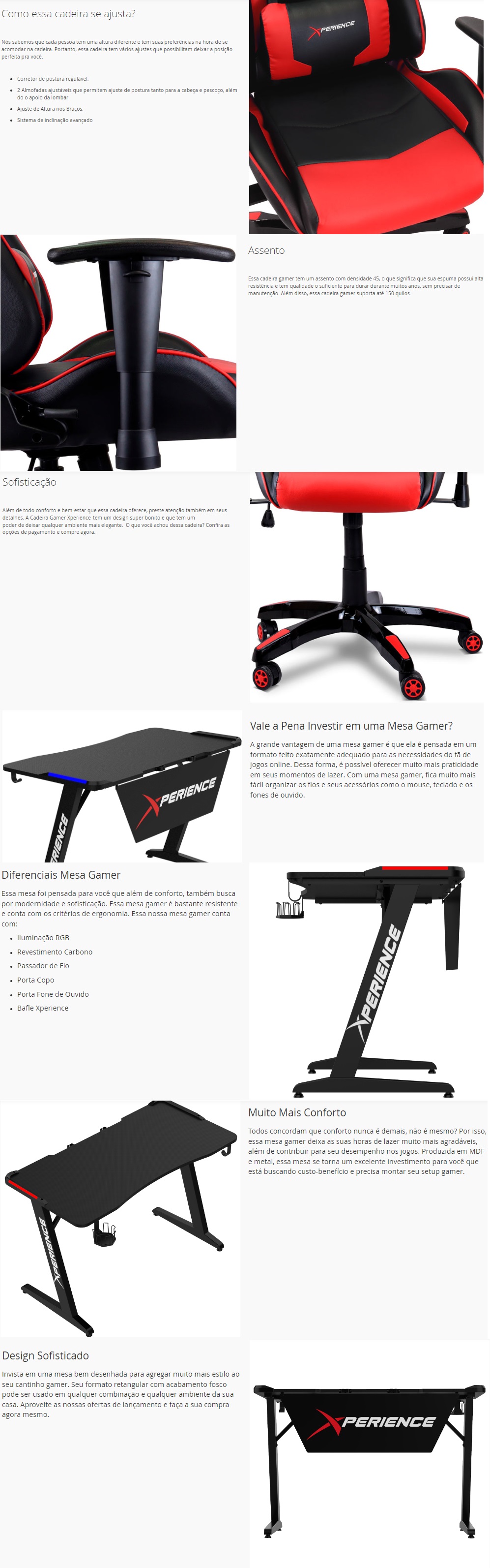 O Kit Mesa Gamer e Cadeira Gamer Xperience é um conjunto gamer completo, com uma mesa espaçosa e uma cadeira ergonômica. A cadeira possui braços ajustáveis e um sistema de inclinação avançado para proporcionar conforto durante longas sessões de jogo. Ambos os itens têm um design atraente em vermelho vibrante, ideal para gamers que buscam um ambiente de jogo estiloso e funcional. Essa mesa foi pensada para você que além de conforto, também busca por modernidade e sofisticação. Essa mesa gamer é bastante resistente e conta com os critérios de ergonomia.