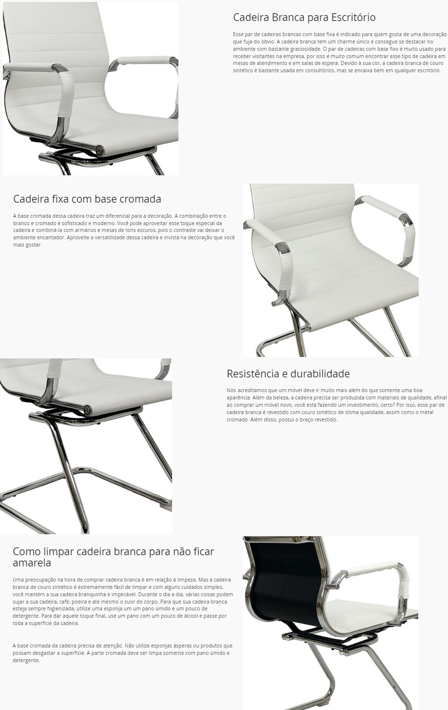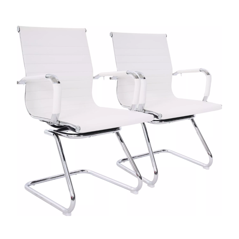 Esse par de cadeiras brancas com base fixa é indicado para quem gosta de uma decoração que fuja do óbvio. A cadeira branca tem um charme único e consegue se destacar no ambiente com bastante graciosidade. O par de cadeiras com base fixo é muito usado para receber visitantes na empresa, por isso é muito comum encontrar esse tipo de cadeira em mesas de atendimento e em salas de espera. Devido à sua cor, a cadeira branca de couro sintético é bastante usada em consultórios, mas se encaixa bem em qualquer escritório.