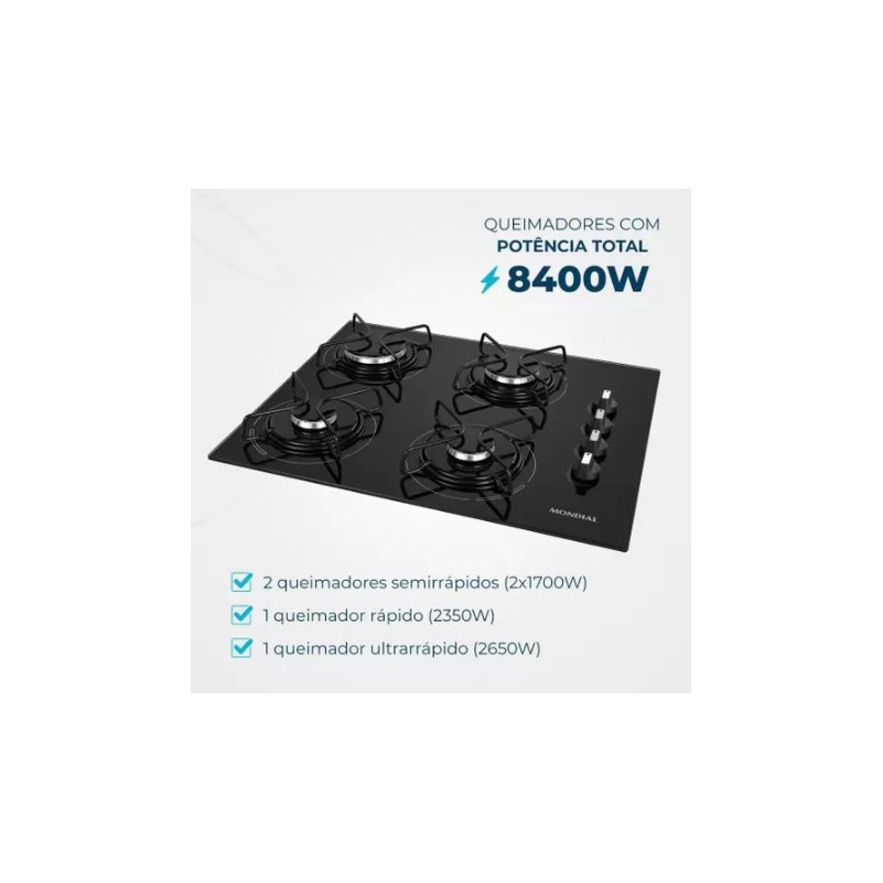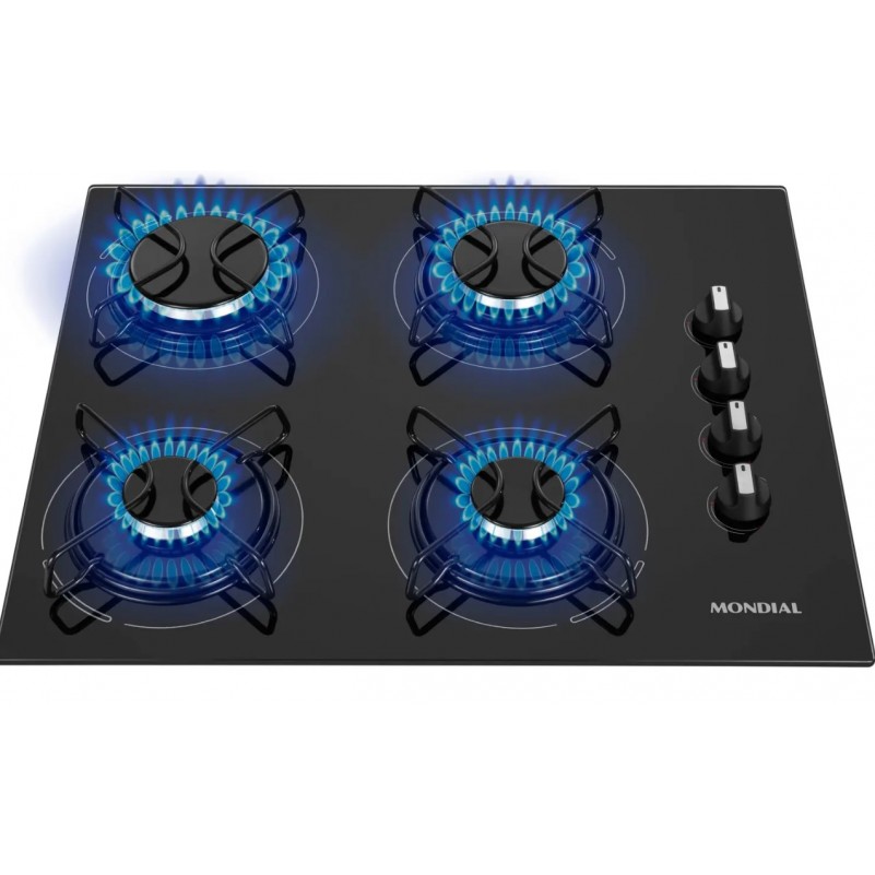 Fogao Cooktop a Gas 4 Bocas Mondial GLP 3300W Automatico Mesa Vidro