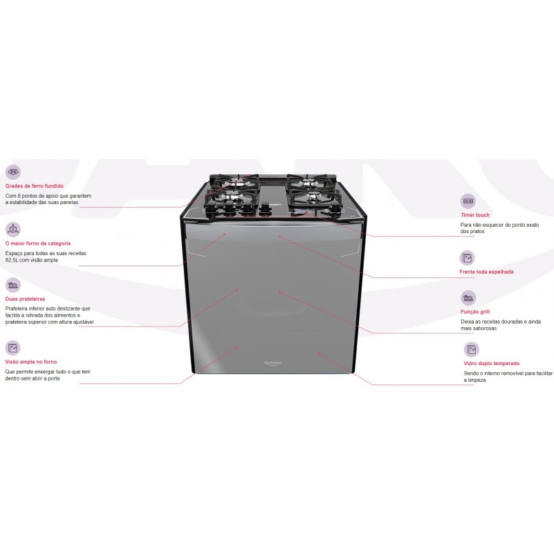 Fogao Embutir 4 Bocas Dako Espelhado com Grill Forno 82L Bivolt