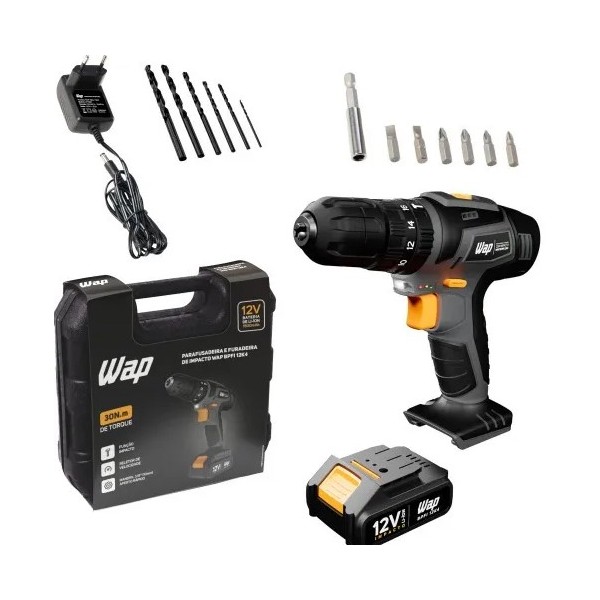 A Furadeira Parafusadeira de impacto 3/8" Wap é a ferramenta ideal para quem busca qualidade e eficiência. Possui tanto o modo parafusadeira quanto modo furadeira com e sem impacto, oferecendo versatilidade na hora do uso. Possui seletor de Torque com 18 níveis na função parafusar, 1 função de perfurar e 1 função de impacto, com um toque máximo de 30 Nm. Possui bateria compacta e removível de Li-íon de 12V com 1500mAh, proporcionando mais desempenho e facilidade em seu trabalho. Conta com Led de iluminação para melhorar a visibilidade do local de trabalho, além de um indicador de carga de bateria e uma pega emborrachada, proporcionando mais conforto durante utilização da ferramenta. Além disso, o usuário não precisa de outra ferramenta para fazer o aperto da broca ou do bit ao utilizar no produto, pois ela possui um Mandril de aperto rápido de 3/8” (10mm). Tudo isso contribui para que você tenha uma excelente experiência na hora de utilizá-la em diversas tarefas. Leve e robusta, a Parafusadeira e Furadeira de Impacto apresenta dois níveis de velocidade, sendo: 0 – 400 RPM / e 0 – 1500 RPM e dois níveis de batidas por minuto na função impacto, sendo a primeira: 0 - 6000 BPM / e a segunda: 0 – 22000 BPM. Ainda acompanha maleta completa com acessórios para facilitar o uso com a ferramenta.
