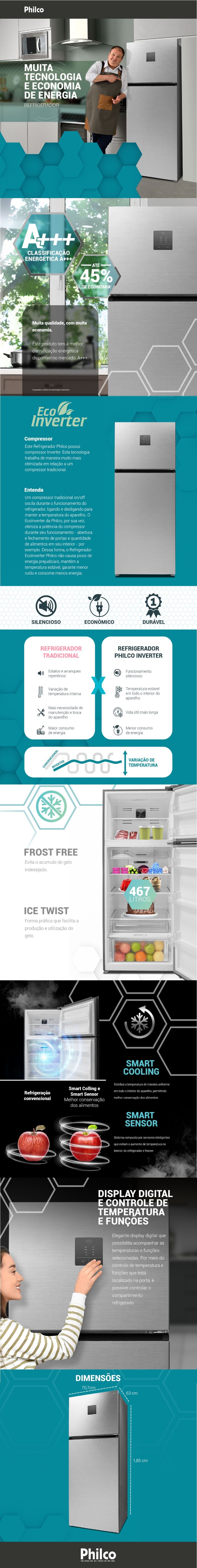 REFRIGERADOR PHILCO 467L FROST FREE INVERTER C/ SENSOR - INOX