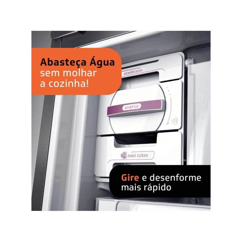 Smart Ice: Saiba quando o gelo está acabando, acelere a produção com o Turbo Gelo e abasteça e desenforme facilmente com o sistema Twist Ice. O gelo fica armazenado em um recipiente portátil e prático