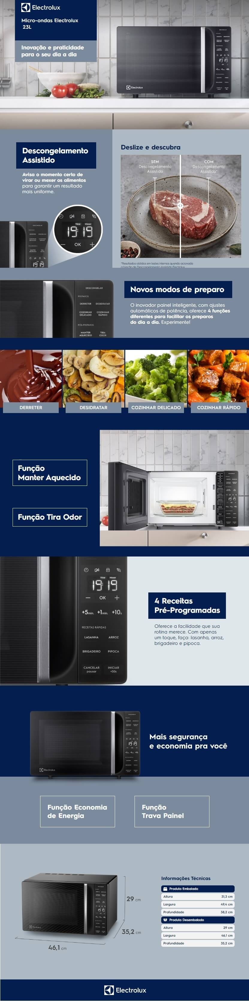 O Micro-ondas Electrolux 23L é pensado para facilitar sua rotina na cozinha. Ele conta com a tecnologia de Descongelamento Assistido da Electrolux para alcançar resultados mais uniformes ao descongelar os ingredientes, avisando no painel o momento certo de virar ou mexer os alimentos. Seu painel inteligente, com ajustes automáticos de potência, disponibiliza quatro modos de preparo diferentes e funcionais para tornar sua rotina mais prática: derreter; desidratar; cozinhar rápido e cozinhar delicado. Acione a Função Desidratar para fazer chips de frutas ou vegetais, além de desidratar ervas para conservá-las por mais tempo. Selecione a Função Cozinhar Delicado se quiser preparar alimentos macios, como peixes e alguns tipos de vegetais. Para vegetais mais duros e carne bovina, utilize a Função Cozinhar Rápido. O Micro-ondas Electrolux possui a Função Manter Aquecido, que conserva suas receitas recém preparadas quentes e deliciosas até o consumo. A função Tira Odor é ideal para manter seu produto livre de possíveis odores dos preparos anteriores graças ao sistema de recirculação do ar interno.