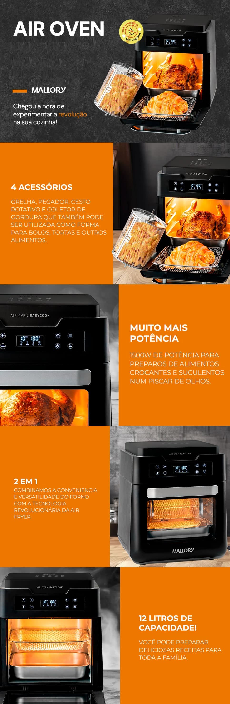 Fritadeira Air Oven 1500W Mallory 12L Visor Vidro Black Luxx