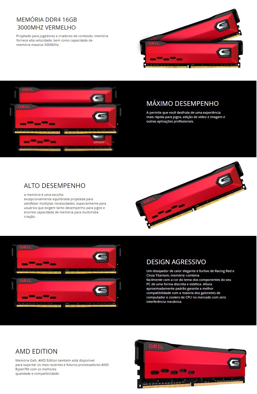 MEMORIA RAM GEIL 16GB DDR4 3000MHZ - VERMELHA