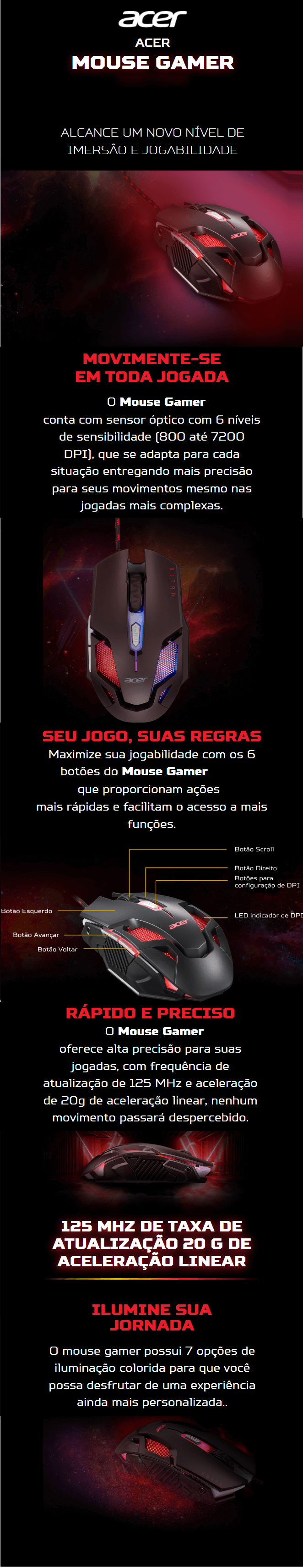 Mouse USB Gamer Acer 7200 DPI Led 6 Botoes 125mHz