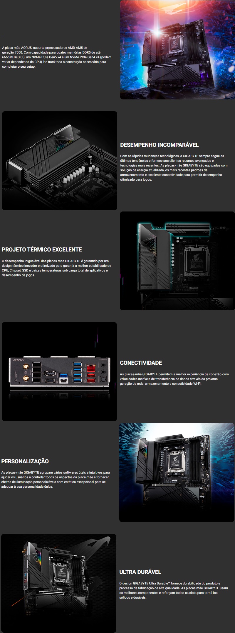 As placas-mãe Aorus Elite também passam por rigorosos testes de resistência para garantir que possam lidar com condições em que outras podem falhar. Esteticamente, este modelo incorpora elementos de design geométrico e off-black robustos para refletir a confiabilidade e estabilidade. Com fornecimento de energia atualizado e opções abrangentes de refrigeração para alimentar as CPUs mais recentes da AMD, além de suporte para memória e armazenamento mais rápidos, é a base perfeita para o seu próximo equipamento de batalha de alta contagem de núcleos.