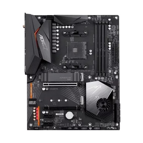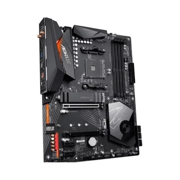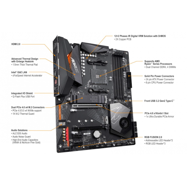 Suporta AMD Ryzen Série 5000/3ª Geração Ryzen/2ª Geração Ryzen/2ª Geração Ryzen com Radeon Vega Graphics/Ryzen com Processadores Gráficos Radeon Vega Canal duplo ECC/Não-ECC DDR4 Unbuffered, 4 DIMMs Solução VRM Digital 12 + 2 Fases com DrMOS Design Avançado Dissipador com Ampliar Dissipador Dupla Ultra-Rápida NVMe PCIe 4.0/3.0x4 M.2 & Guarda Térmica Única Áudio AMP-UP com ALC1200 LAN Gigabit Intel RGB FUSION 2.0 com luz LED endereçável multi-zona Smart Fan 5-Cabeçalhos híbridos com FAN STOP Painel frontal USB 3.2 Gen