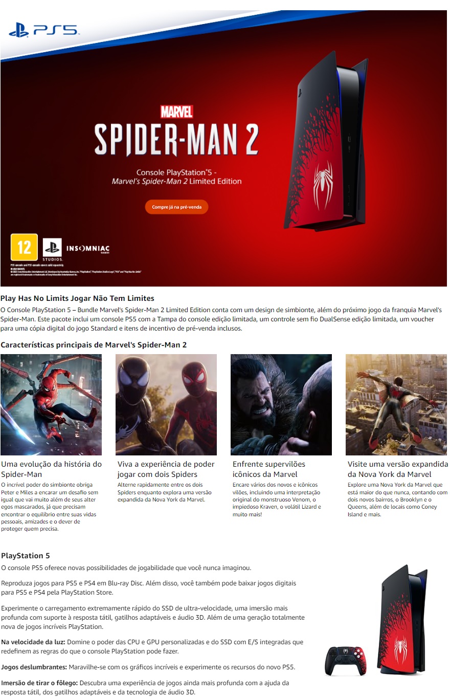 Console Ps5 Sony 8K BluRay SSD 825GB Branco Marvel Spider Man 2