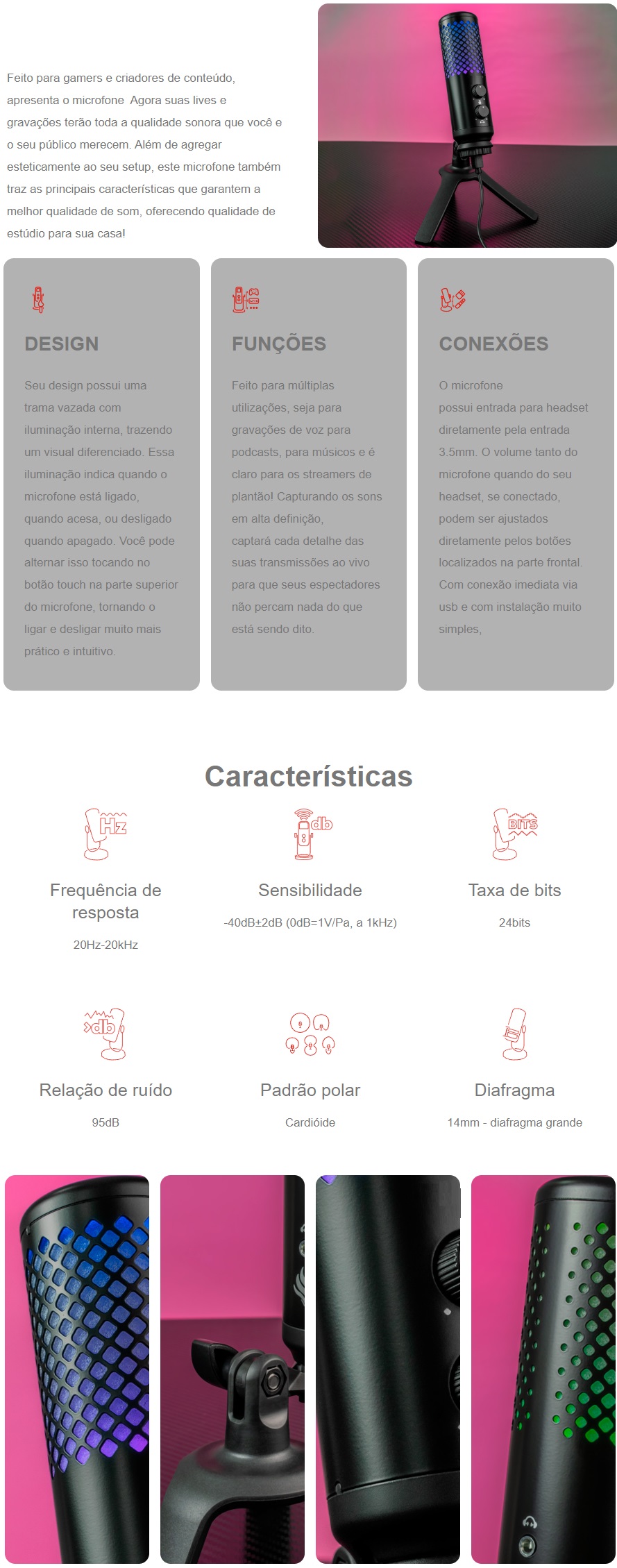 MICROFONE USB RGB CARDIOIDE C/ ADAPTADOR USB C