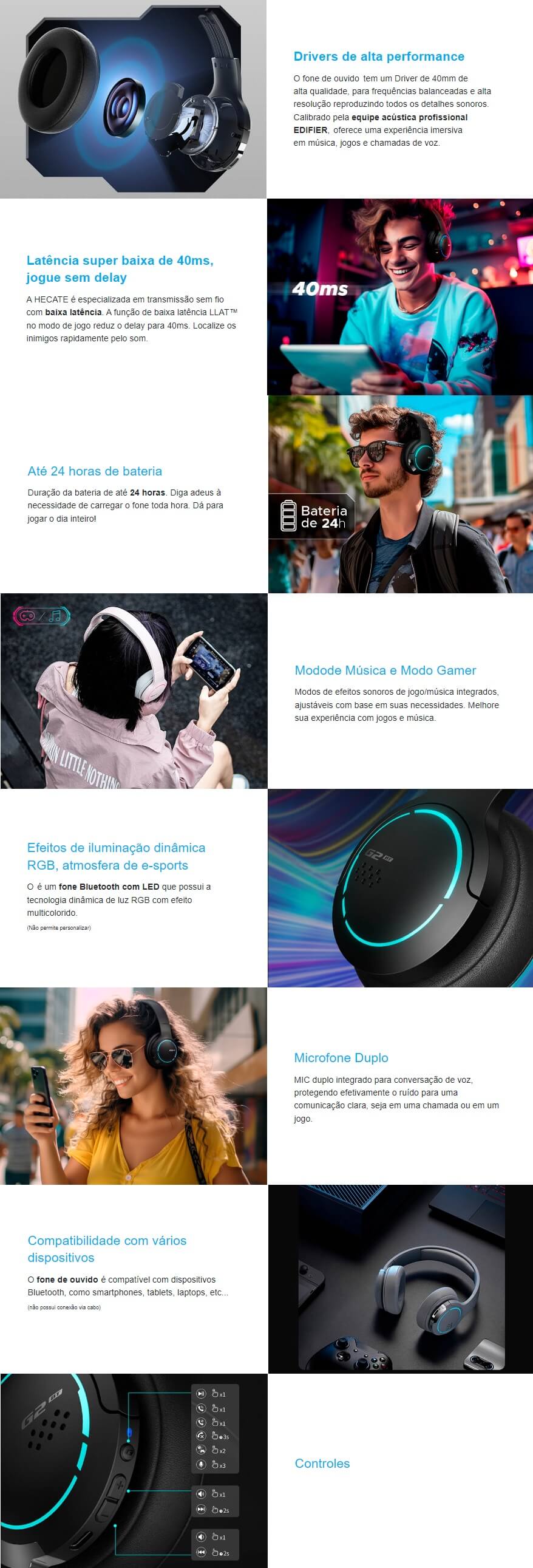 O fone de ouvido tem um Driver de 40mm de alta qualidade, para frequências balanceadas e alta resolução reproduzindo todos os detalhes sonoros. Calibrado pela equipe acústica profissional EDIFIER, O fone oferece uma experiência imersiva em música, jogos e chamadas de voz. A HECATE é especializada em transmissão sem fio com baixa latência. A função de baixa latência LLAT no modo de jogo reduz o delay para 40ms. Localize os inimigos rapidamente pelo som. Duração da bateria de até 24 horas. Diga adeus à necessidade de carregar o fone toda hora. Dá para jogar o dia inteiro!