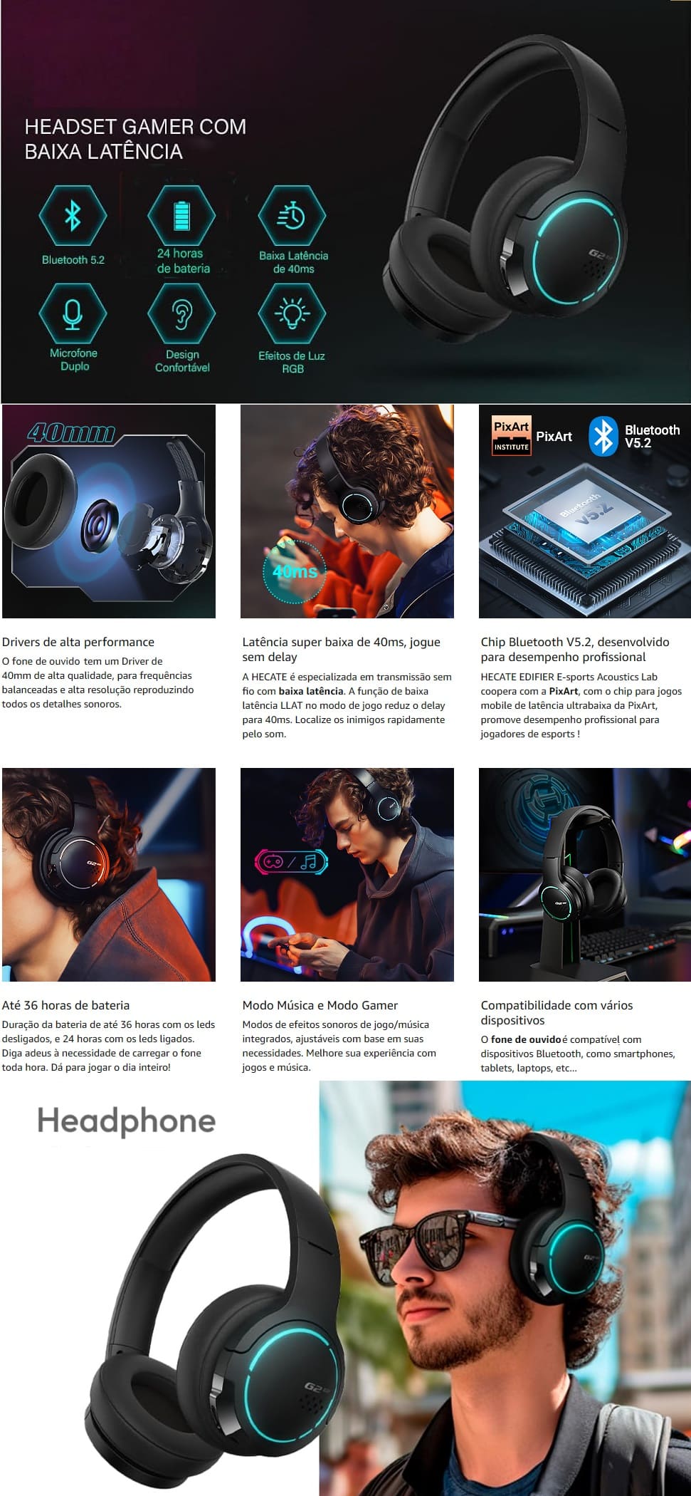 Fone de ouvido Bluetooth Edifier 94db com Led RGB