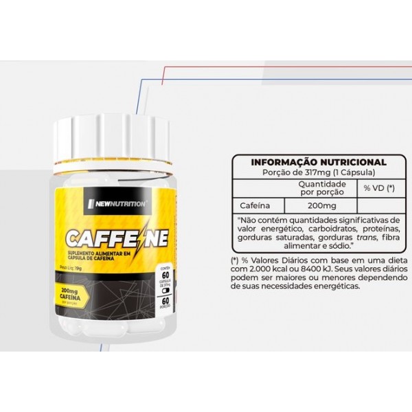 A Cafeína NewNutrition é um suplemento alimentar que contém 200mg de cafeína anidra, por porção. A cafeína em cápsulas pode ser utilizada antes de treinamentos ou de acordo com suas necessidades individuais.