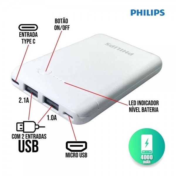 Carregador Portatil Power Bank Phil 4.000mah Branco