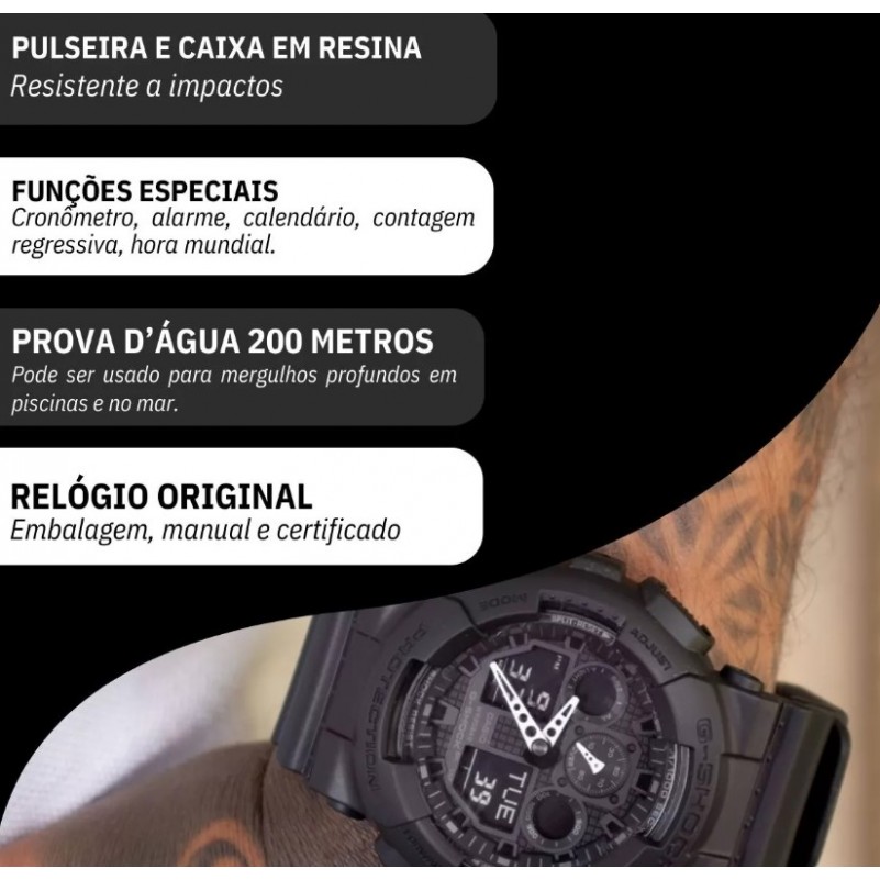 Um diodo emissor de luz (LED) é usado para iluminar o mostrador do relógio o recurso de um interruptor de luz automático que ilumina a tela quando o relógio está inclinado para a face A estrutura resistente a choques protege contra impactos e vibrações A caixa é projetada para proteger o relógio de campos magnéticos Exibe a hora atual nas principais cidades e áreas específicas ao redor do mundo Possui mecanismo Analógico/Digital, a pulseira é na cor Preto, fabricada em Resina, com 29 cm de comprimento e possui Fecho Fivela. A Caixa (peça onde fica o mostrador) é fabricada em Resina, possui fundo do tipo Parafusada, mede 4,8 cm de diâmetro.Mostrador preto e digital invertido (números claros e fundo escuro) Cronômetro com medição de até 1/1000 de segundos.