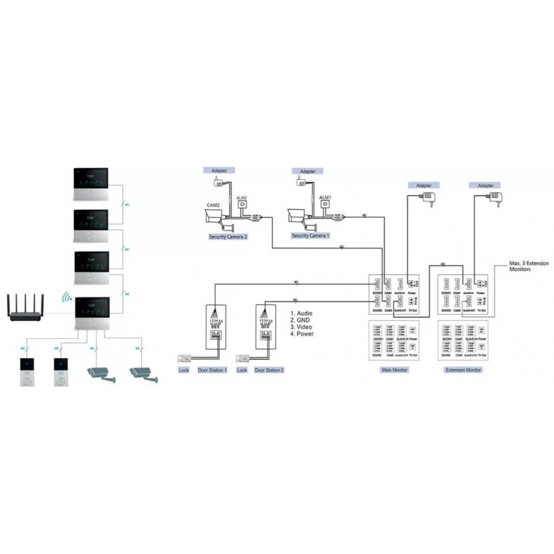 Com o App Smart próprio do interfone você pode monitorar as CCTV e as unidades externas remotamente em tempo real, além de conseguir destravar as fechaduras elétricas, por exemplo de um portão social e de um portão eletrônico de garagem. É possível mudar os modos da unidade externa, para "Em Casa", "Modo de Sono", "Fora de Casa" e "Detecção de Movimento", Além gravar vídeos e tirar fotos através da unidade externa e das CCTV e armazenar na galeria do seu celular. No modo "Fora" de Casa: quando alguém aperta a campainha a unidade externa diz: "não tem ninguém em casa, mas você pode deixar uma mensagem"(Em inglês) simultaneamente em que te envia um alerta no celular com a foto do visitante e mostra em tempo real o monitoramento da unidade externa, onde você pode atender e falar falar com o visitante, ou recusar a chamada, ou abrir a portão/portão, em simultâneo é feito uma gravação do visitante na unidade interna, que pode ser acessado pelo celular também. No Modo "Em Casa", a unidade externa toca o som na unidade externa para o visitante ouvir, e na unidade interna, além de receber um alerta no celular com a foto do visitante, uma ligação pra atender (igual no modo fora de casa), e uma gravação do visitante. No modo "Sono" a unidade interna fica silenciosa, enquanto uma notificação com a foto do visitante é enviada no seu celular, e gravação do visitante. Esse Interfone possui um app próprio de casa inteligente que pode usar serviços de terceiros como a Alexa e Google Assitant, alem de permitir adicionar outros produtos inteligentes como câmeras de segurança, tomadas, lâmpadas, sensores, utensílios, eletrodomésticos, entre outros objetos inteligentes. O app permite que um usuário compartilhe com até 20 membros.