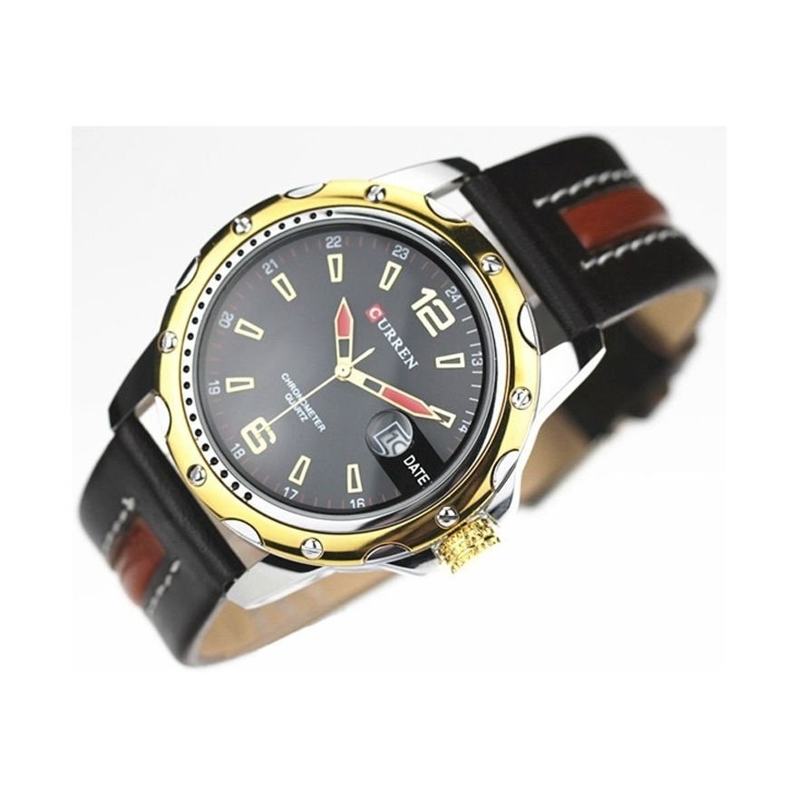 RELOGIO ANALOGICO CURREN C/ DATA BORDA DOURADA VIDRO EM CRISTAL MINERAL