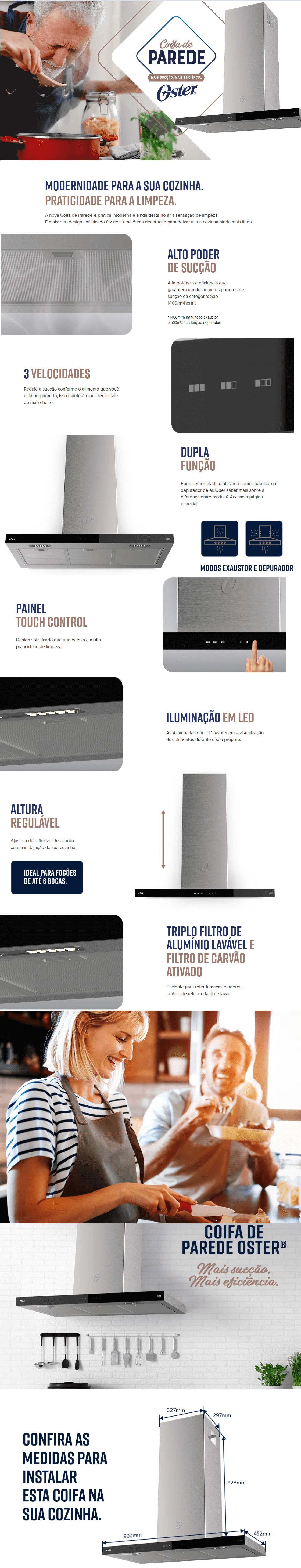 Coifa de Parede 90cm Oster Painel Touch 3 Velocidades