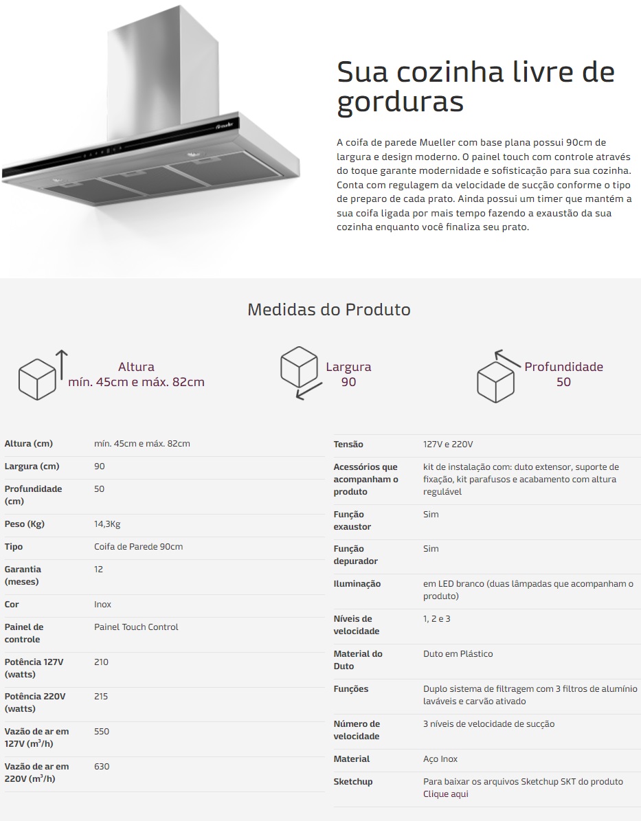 COIFA DE PAREDE PLANA 90CM 210W MUELLER EM INOX E VIDRO