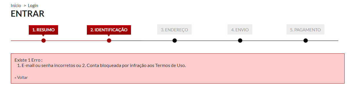 Essa mensagem aparece apenas em 2 situações. Quando o email ou a senha estão incorretos, ou quando o usuário esta bloqueado na plataforma por infração aos termos de uso (pedidos não pagos, pedidos em duplicidade, etc). Verifique também a compartibilidade de navegador, sistema operacional, e se não há acentuação nem espaços antes e no final do email ou da senha quando estiver digitando seus dados.