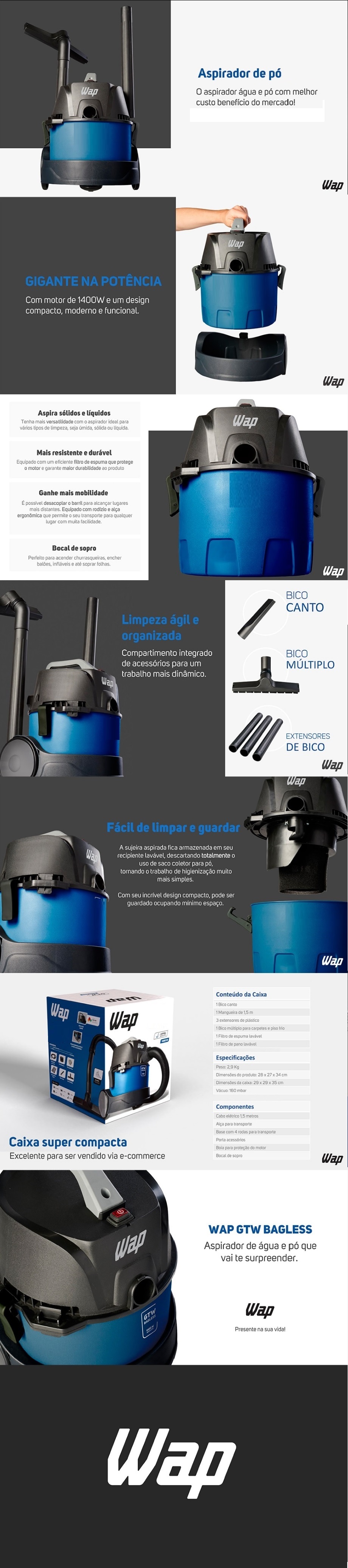 ASPIRADOR DE PO E AGUA WAP 1400W 6L - C/ BOCAL DE SOPRO - AZUL E PRETO