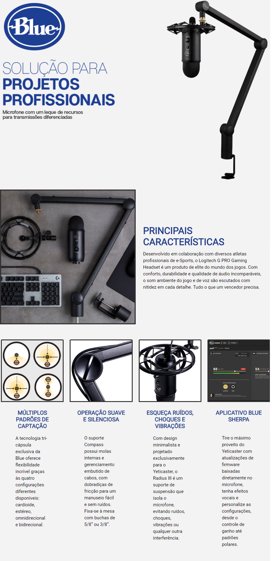 MICROFONE CONDENSADOR DE ESTUDIO USB BLUE - 4 PADRÕES DE CAPTAÇÃO - PRETO