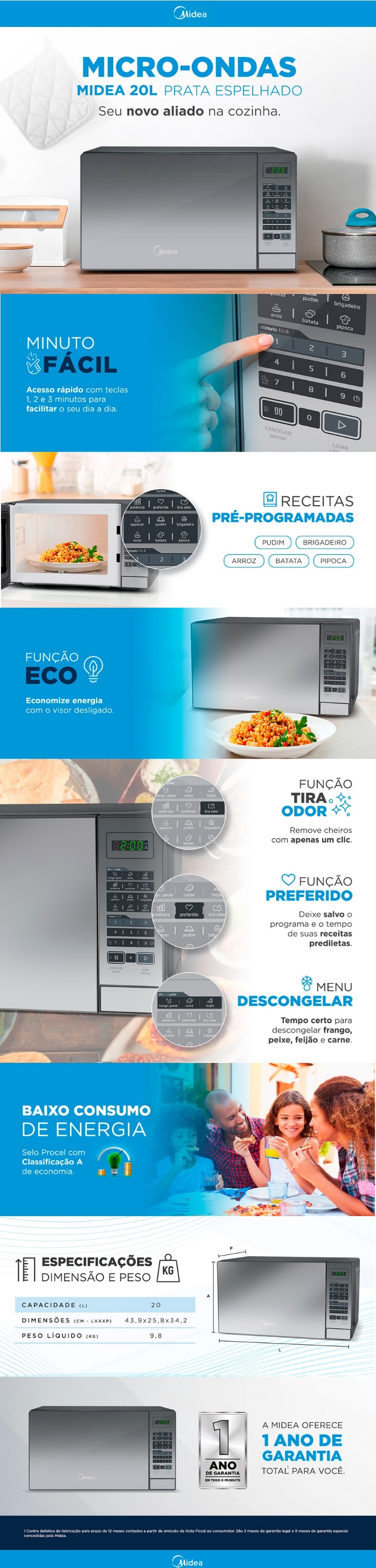 MICROONDAS MIDEA 20L ESPELHADO 700W DISPLAY DIGITAL C/ TIRA ODOR