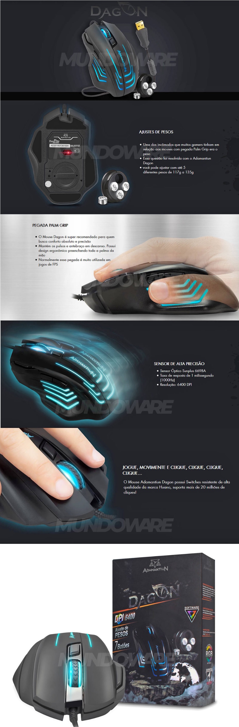 MOUSE GAMER ADAMANTIUN 6400DPI COM AJUSTE DE PESO - 7 BOTOES