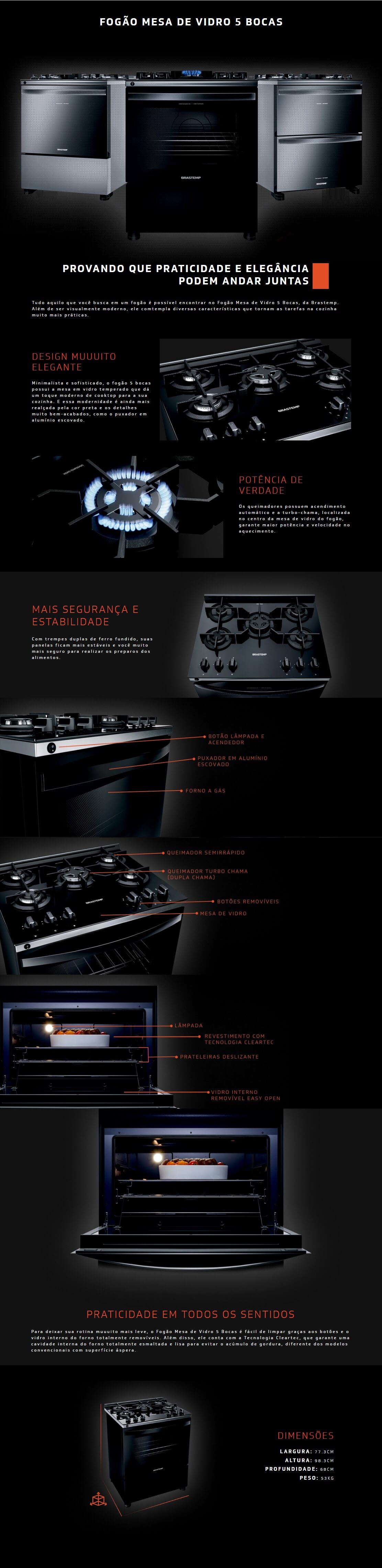 FOGÃO BRASTEMP 5 BOCAS COM MESA DE VIDRO - TURBO CHAMA