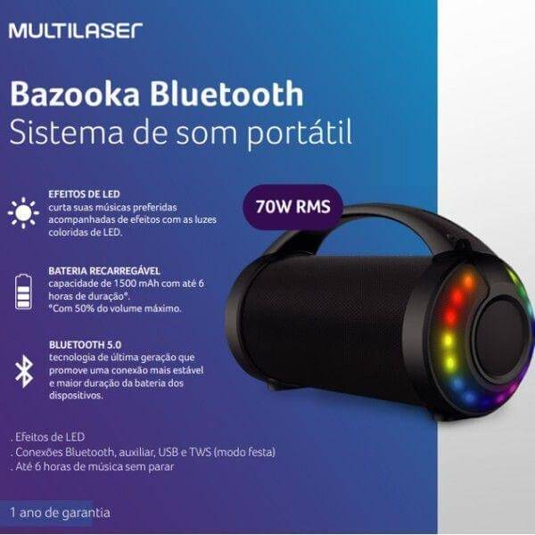 CAIXA DE SOM MULTILASER BLUETOOTH 70W LED RGB - BATERIA 6H - PRETA