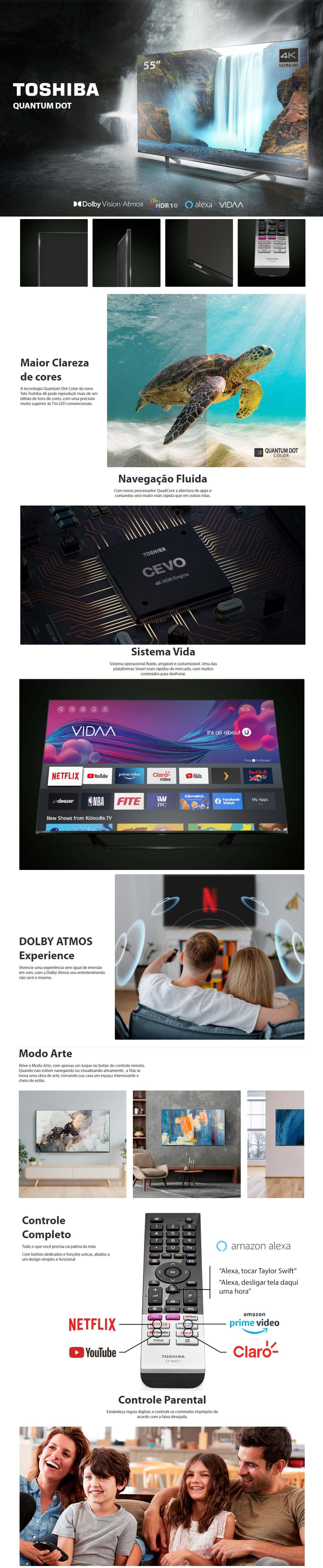 Com a Tela 4K de 55 polegadas Toshiba, você terá realidade além dos pixels! Sua tecnologia permite a reprodução de mais de um bilhão de tons de cores e precisão muito superior às TVs LED convencionais. Com nosso processador Quad-Core, a abertura de apps e comandos será muito mais rápido que em outras telas. O sistema operacional VIDAA é fluído, amigável e customizável, uma das mais rápidas do mercado e com muitos conteúdos para desfrutar. Vivencie uma experiência sem igual de imersão em som, com a Dolby Atmos Experience. Acompanha um controle remoto completo, tenha tudo o que precisa em suas mãos com botões Netflix, Youtube, Amazon Prime, entre outros que vão garantir uma experiência única e fácil. Estabeleça regras digitais e controle os conteúdos impróprios de acordo com a faixa desejada através da função de controle parental. E ainda conta com o Modo Arte, em apenas um toque no botão do controle remoto sua tela se torna uma obra de arte!