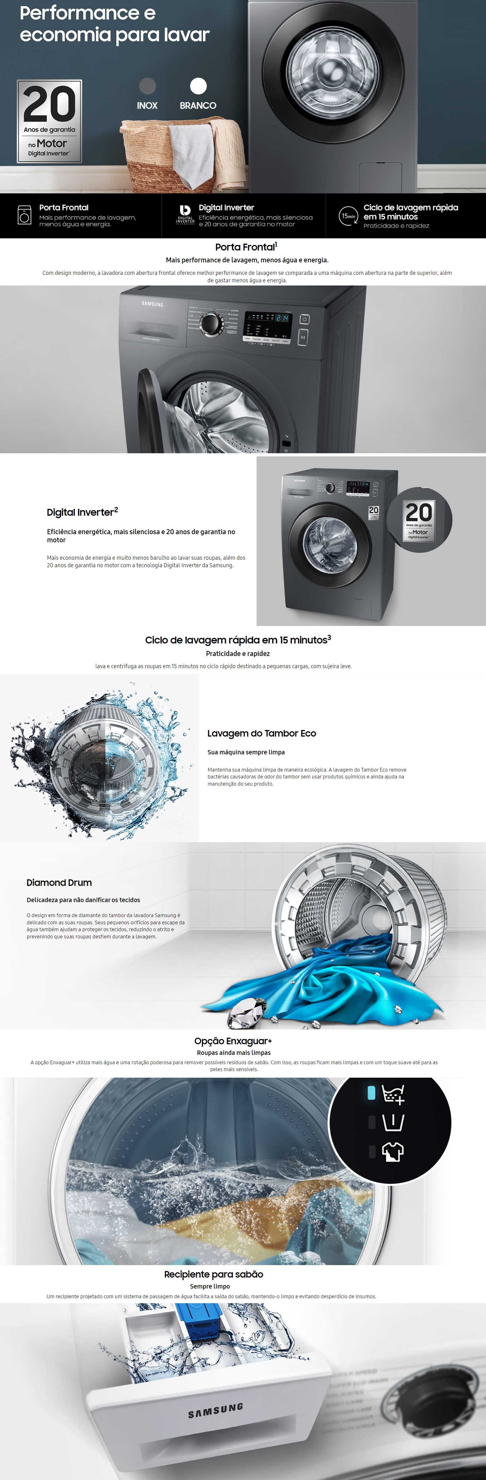 Lavadora de Roupas Samsung 11kg Branca Cesto em Inox 1400 rpm