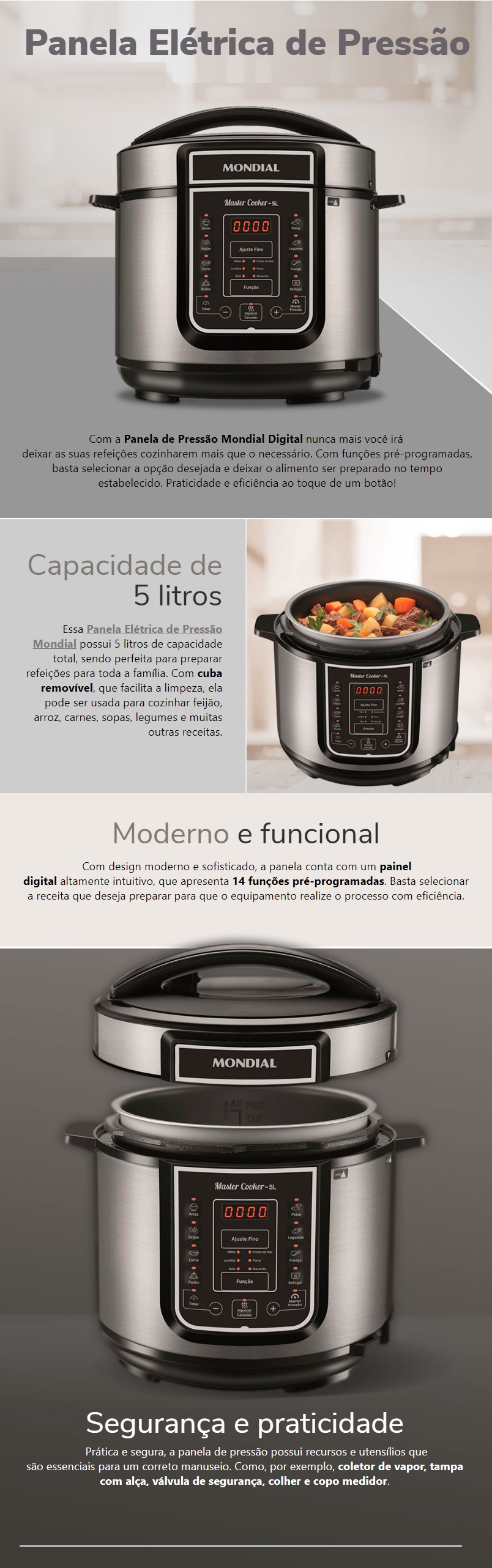 PANELA DE PRESSAO 220V MONDIAL 900W - C/ PAINEL DIGITAL - 5L - INOX/BLACK