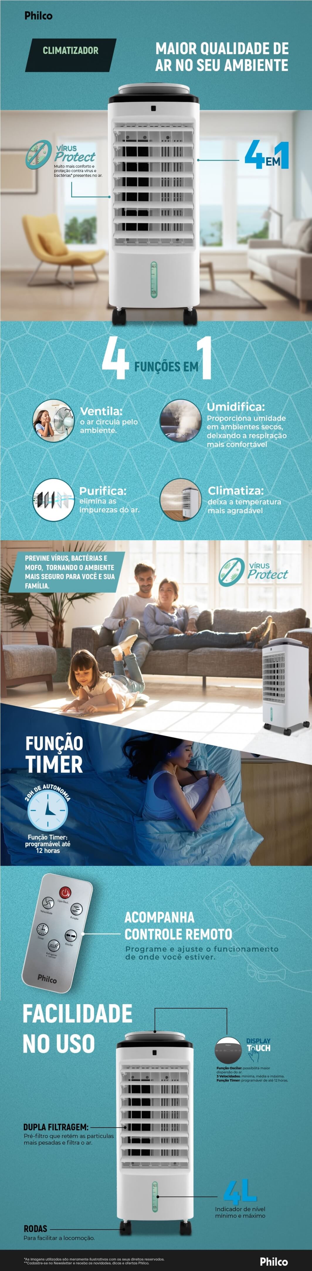 CLIMATIZADOR DE AR 4 EM 1 FRIO PHILCO - 3 VELOCIDADES C/ RESERVATORIO DE 4L
