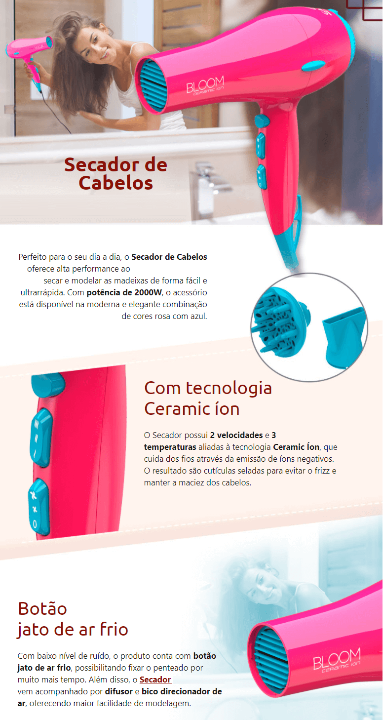 SECADOR DE CABELOS PINK 2000W ULTRA CERAMIC ITALY 220V