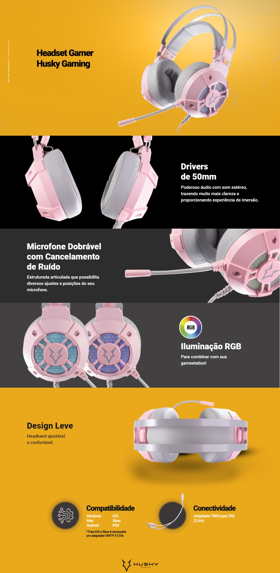 HEADSET GAMER HUSKY STEREO RGB 50MM P2 - ROSA