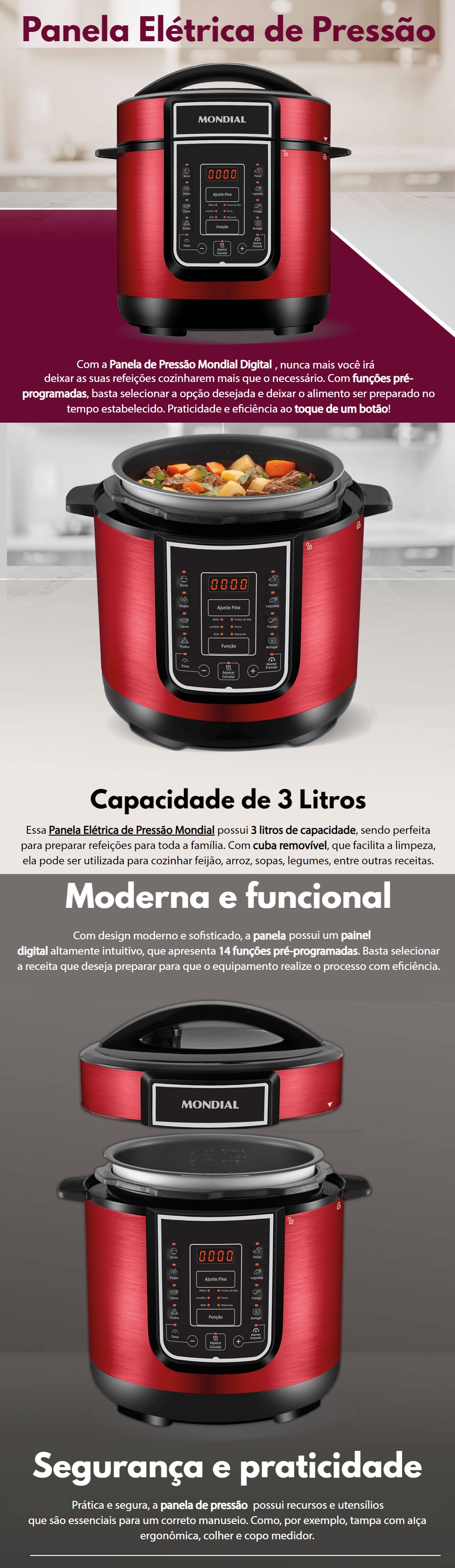 PANELA DE PRESSAO ELETRICA MONDIAL 3L 220V VERMELHA - 700W DIGITAL