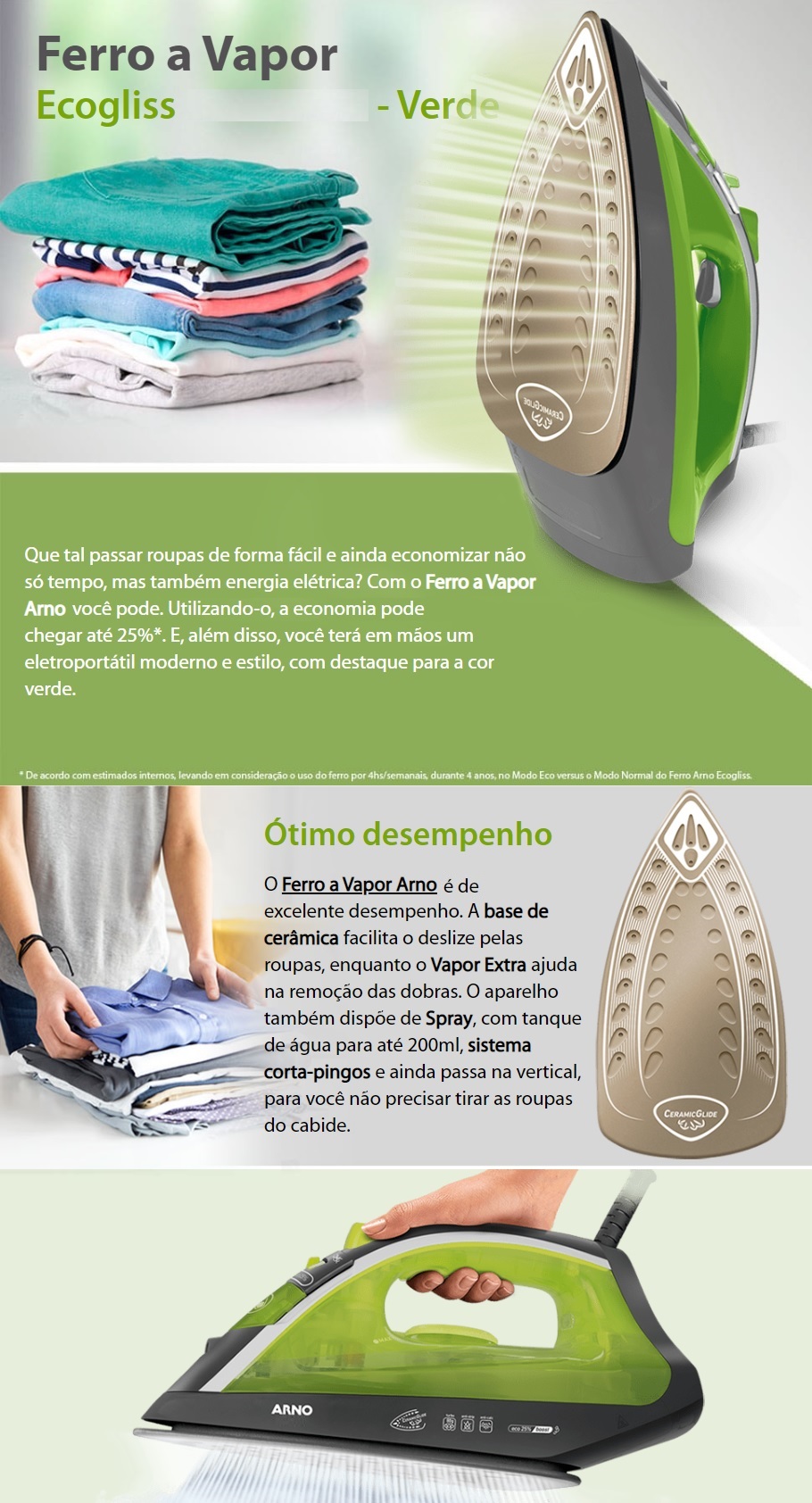 FERRO DE PASSAR A VAPOR ARNO C/ BASE CERAMICA E SPRAY - VERDE