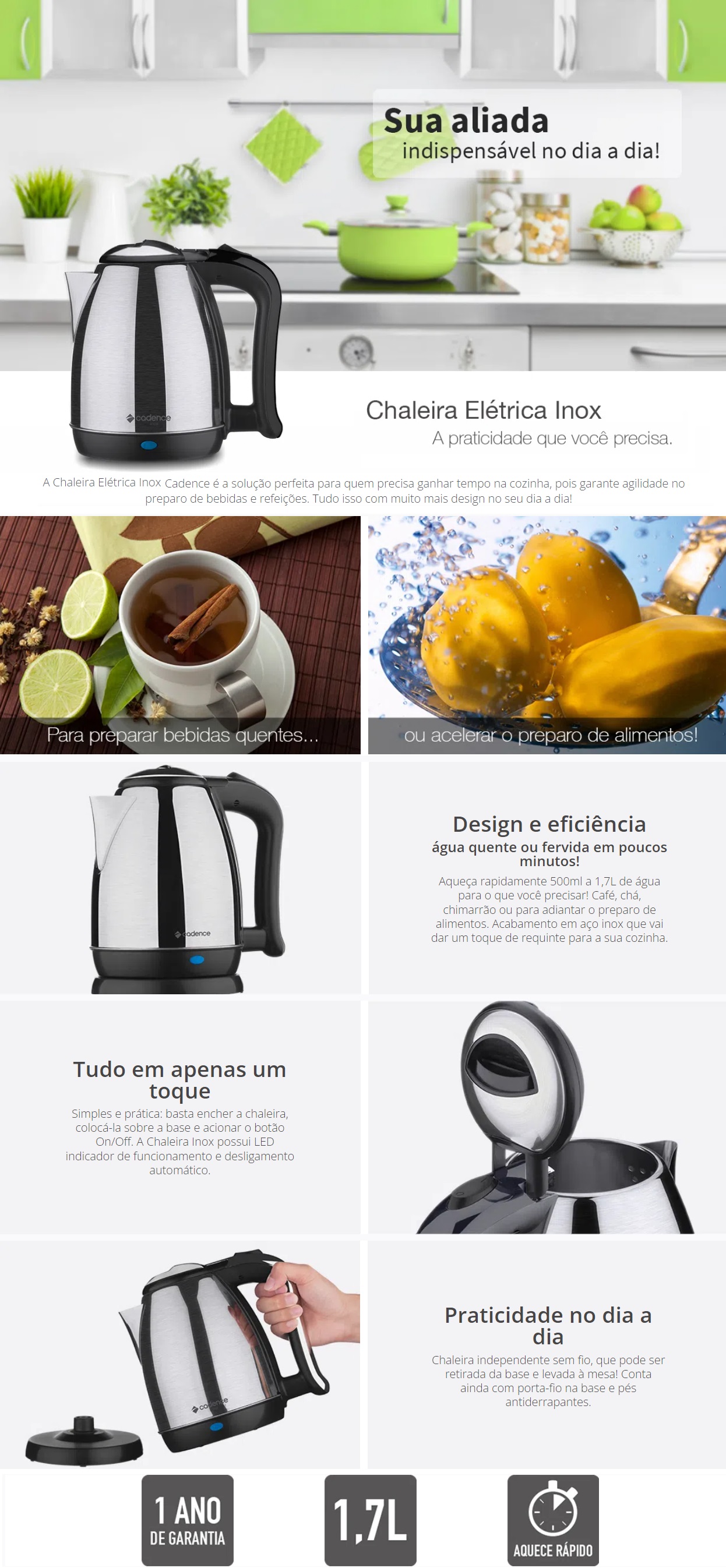 CHALEIRA ELETRICA CADENCE 1,7L INOX ESCOVADO