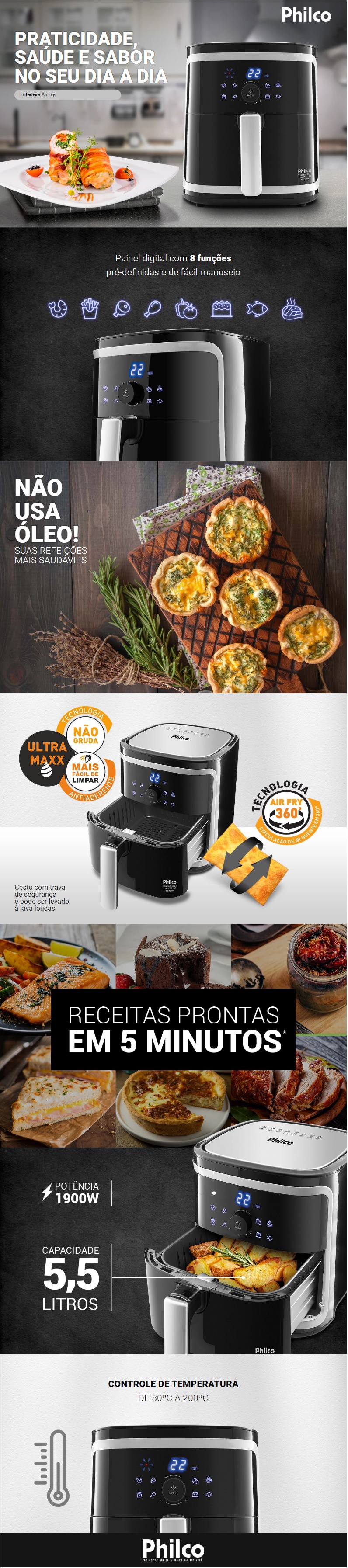 Fritadeira Digital Air Fryer Philco 5,5l Preta 1900w