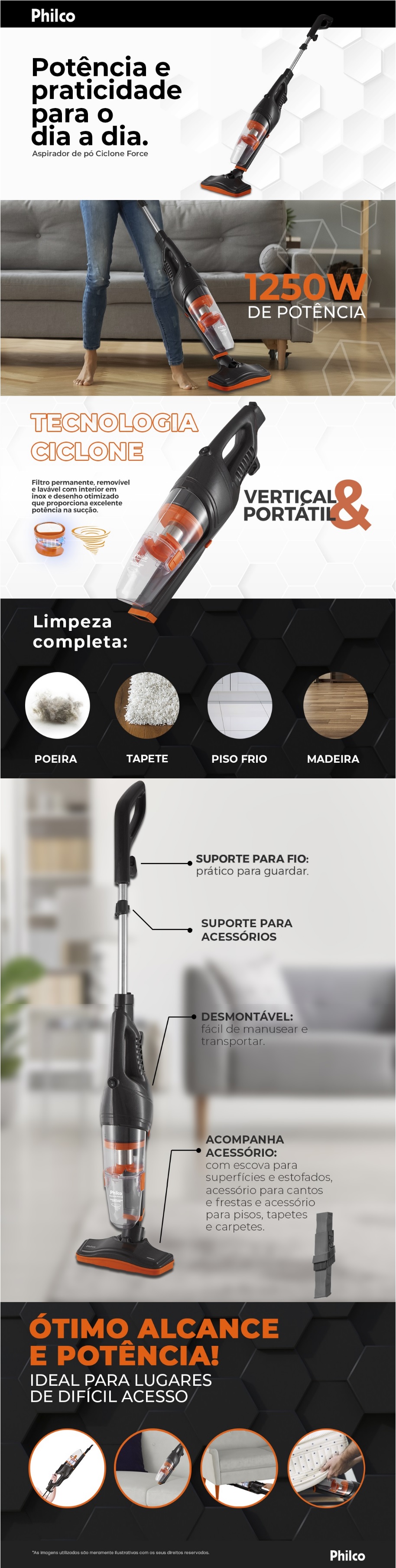 ASPIRADOR DE PO PHILCO 2C1 1250W C/ CABO DE 5M - PRETO/LARANJA