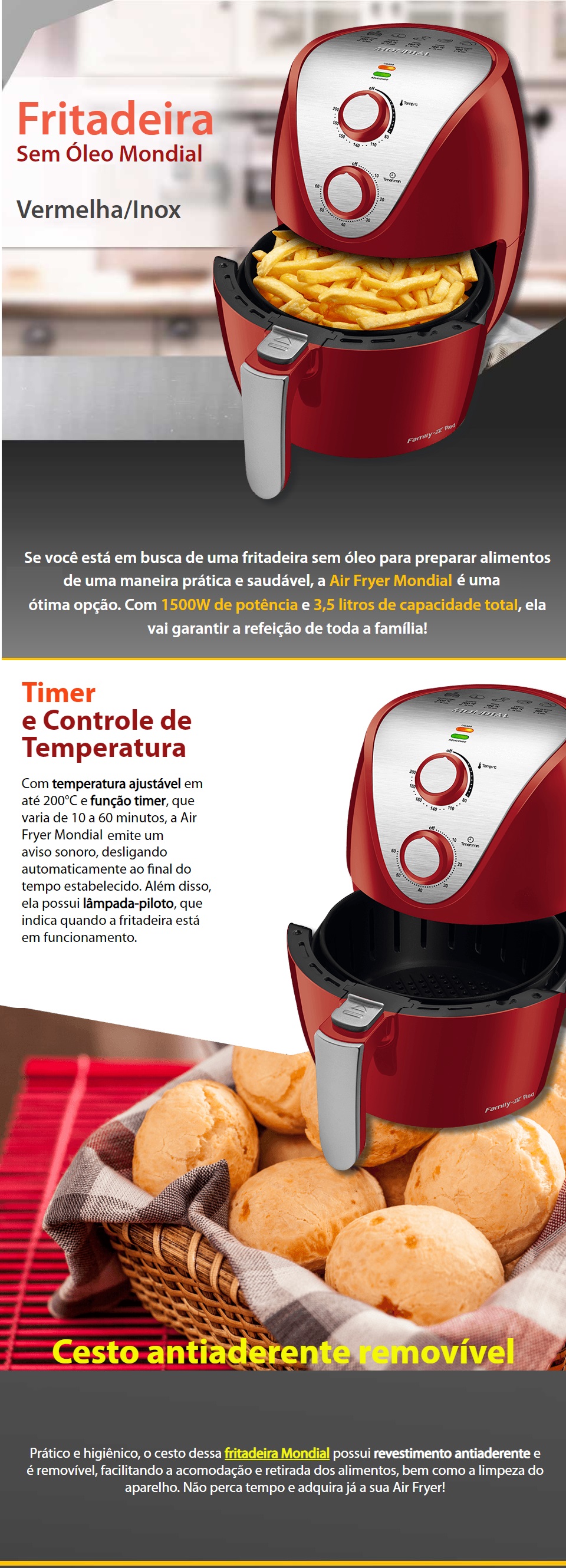 FRITADEIRA AIR FRYER MONDIAL 3.5L 1500W - VERMELHA 220V