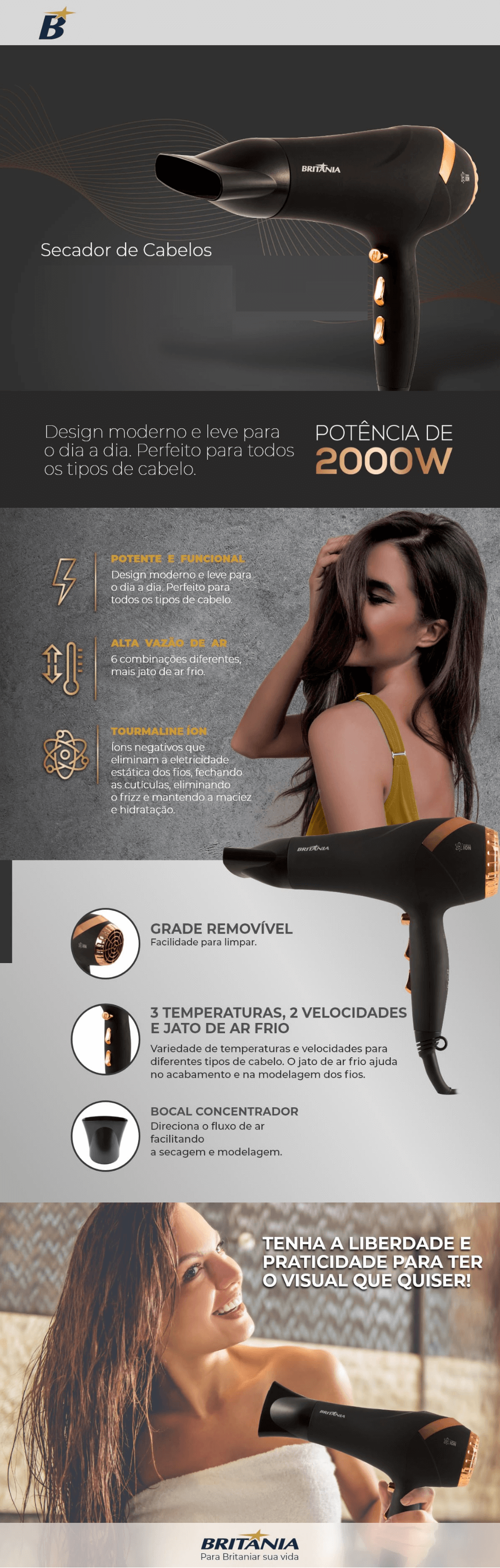 Secador de Cabelos Britania 2000W Ion Tourmaline Prata
